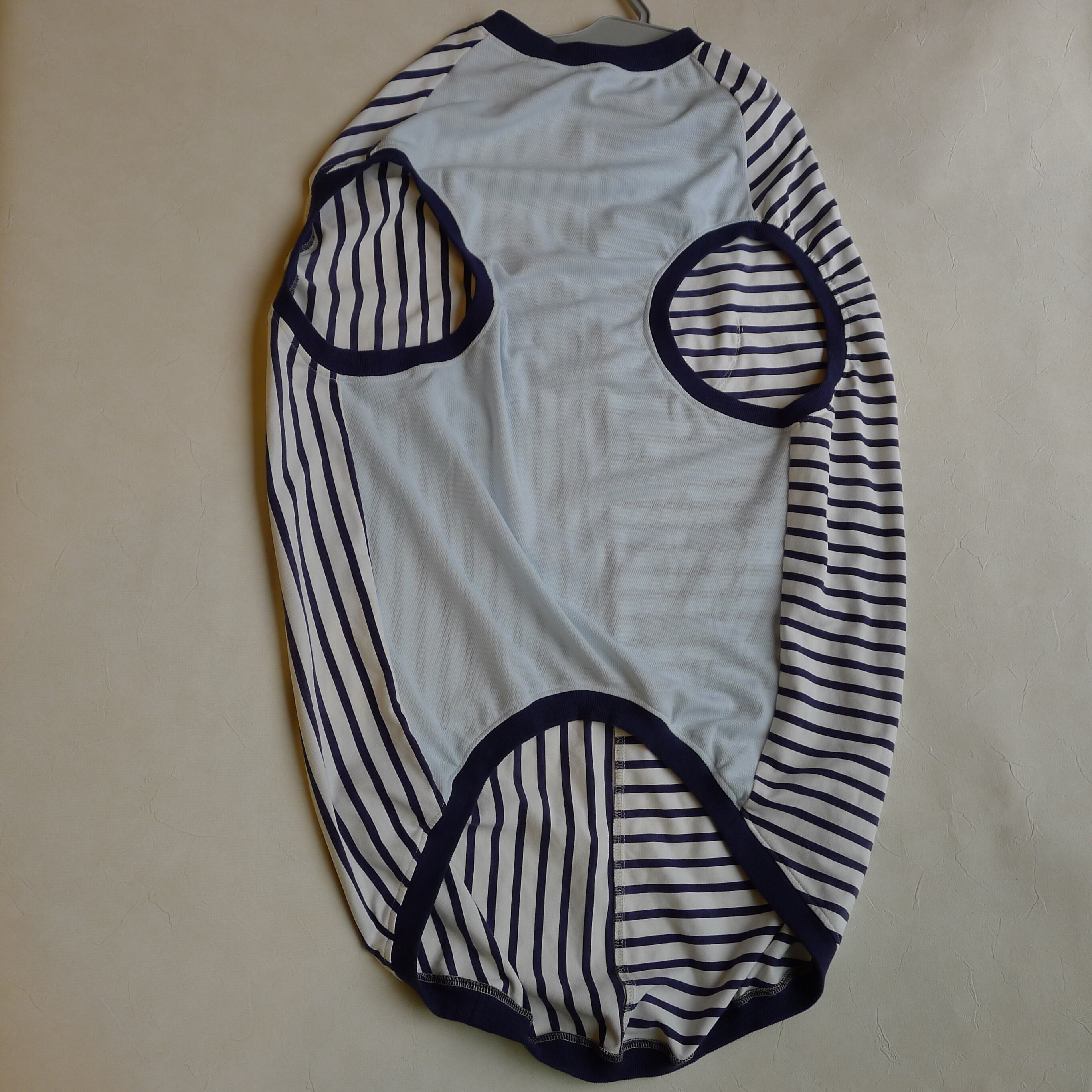 伸縮性のメッシュ生地、紺色と白のボーダー柄